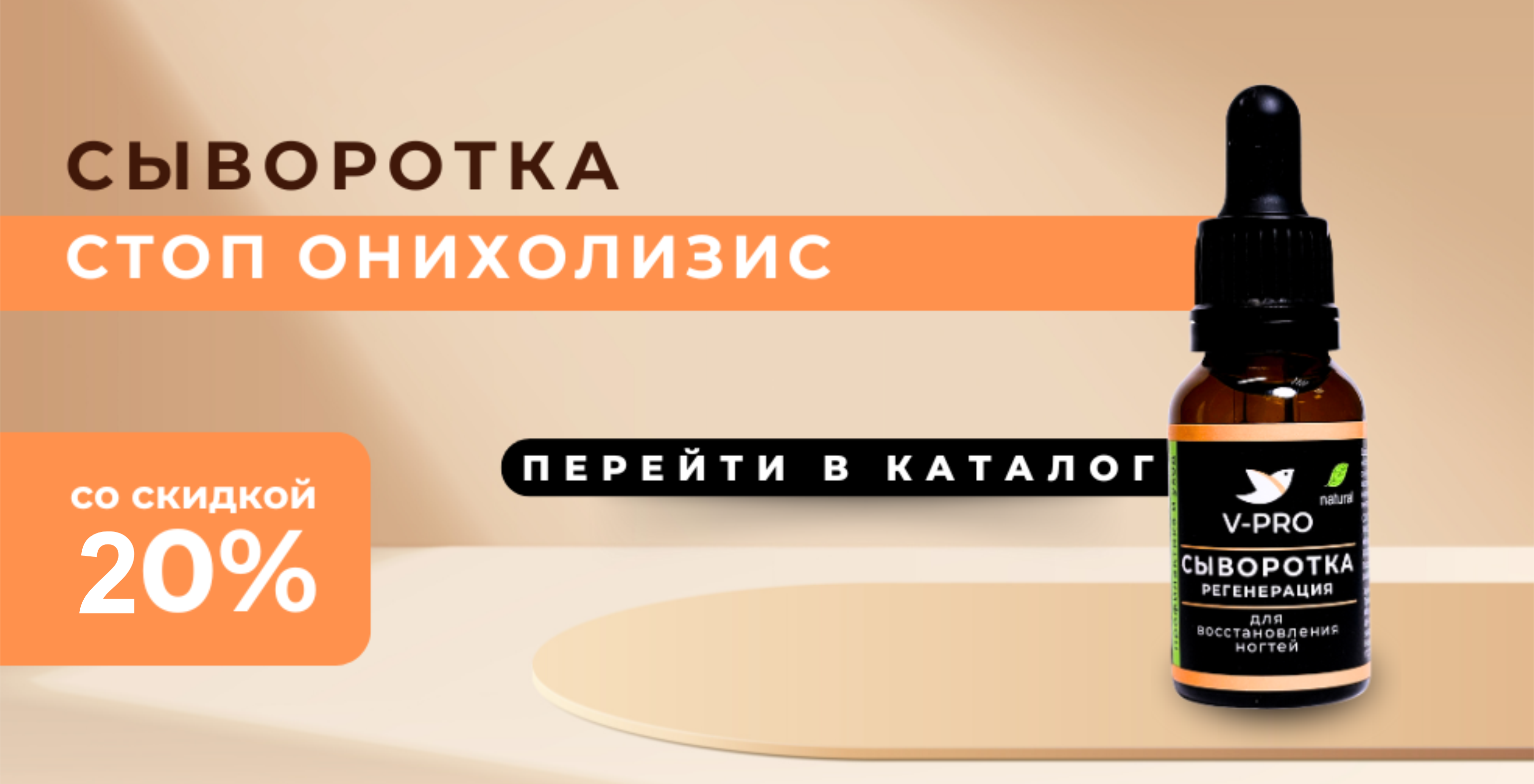 СКИДКА 20% НА СЫВОРОТКУ РЕГЕНЕРАЦИЯ ДЛЯ ВОССТАНОВЛЕНИЯ ВАШИХ НОГТЕЙ и МАСЛО СТОП ОНИХОЛИЗИС ОТ V-PRO, ЧТОБЫ ПЕРЕЙТИ В КАТАЛОГ, НАЖМИТЕ НА БАННЕР