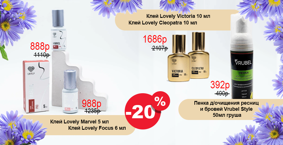 ДЕЙСТВУЕТ СКИДКА 20% НА КЛЕЙ ДЛЯ НАРАЩИВАНИЯ РЕСНИЦ LOVELY MARVEL 5 ML, LOVELY FOCUS 6 ML , LOVELY VICTORIA 10 MVLL, LOVELY CLEOPATRA 10ML И ПЕНКУ ДЛЯ ОЧИЩЕНИЯ РЕСНИЦ VRUBEL 50 ML, ЧТОБЫ ПЕРЕЙТИ В КАТАЛОГ, НАЖМИТЕ НА БАННЕР