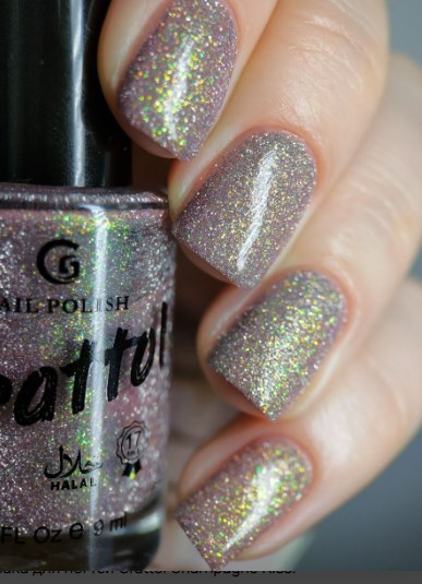 "Champagne Kiss" - жемчужно-бежевый с лиловым подтоном лак с серебряным светоотражающим глиттером и золотисто-зеленым пигментом Аврора, уходящим в сине-голубой отлив.