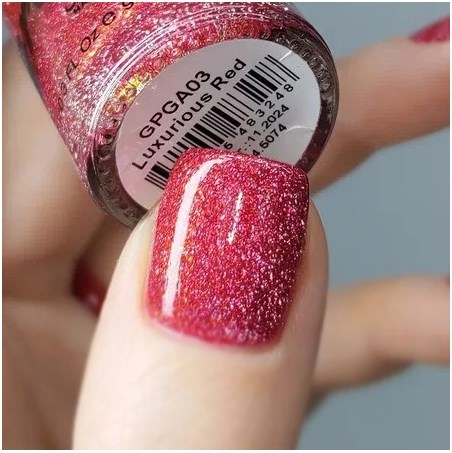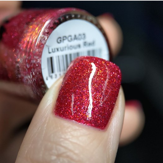 "Luxurious Red" - ягодно-красный лак с серебряным и красным светоотражающим глиттером и золотисто-оранжевым пигментом Аврора.