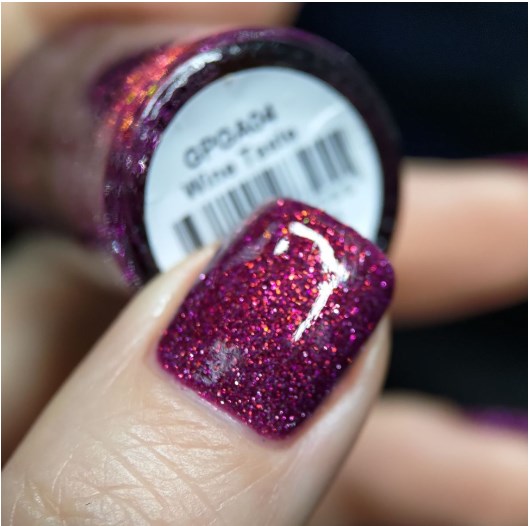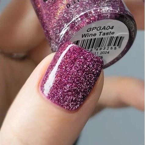 "Wine Taste" - лак в оттенке фиолетовая фуксия с серебряным и красным светоотражающим глиттером и с оранжево-красным пигментом Аврора, уходящим в зелено-голубой блик.