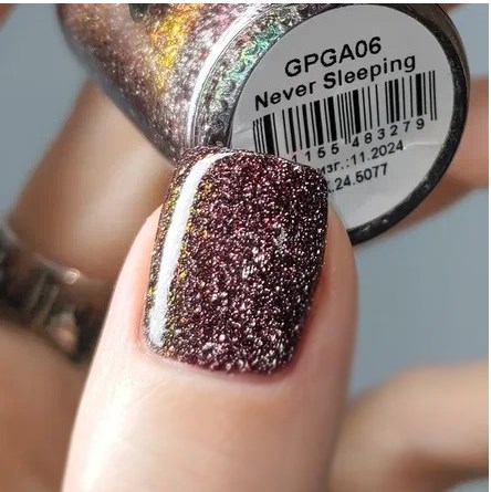 "Never Sleeping" - черная вуаль с серебряным и красным светоотражающим глиттером и оранжево-красным пигментом Аврора, уходящим в зеленый отлив.
