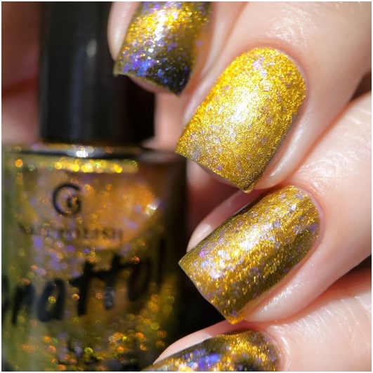 "Queen Leila" - черное желе с золотым (пшеничным) магнитным бликом и разноразмерной рваной синелетовой слюдой.