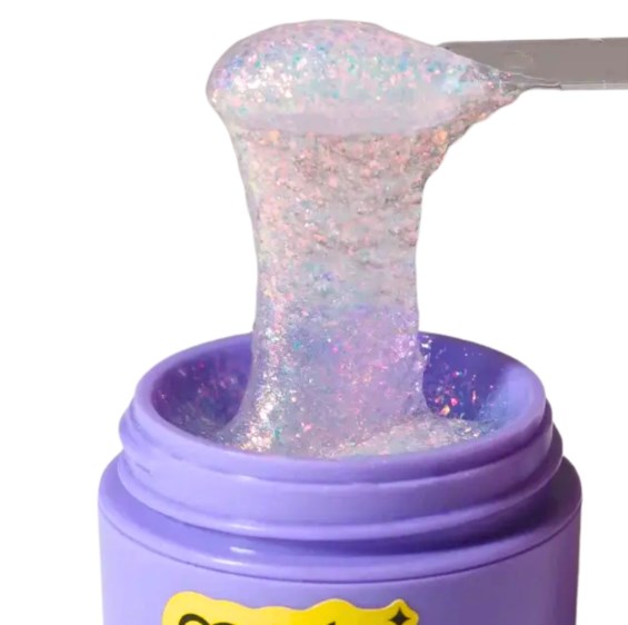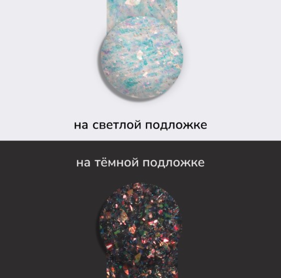 Гели имеют прозрачную цветовую основу. Хлопья Юки в составе создают голографические переливы.