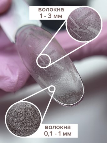 3. Стекловолокно в геле не "торчит" при выкладке на ноготь и не "колется" при опиле, хотя с такими проблемами часто сталкиваются мастера, замешивая стекловолокно в гель самостоятельно. До добавления стекловолокна в гель мы обработали его специальным составом, чтобы полностью исключить неприятное "торчание" волокон в разные стороны.