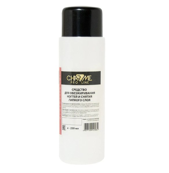 Жидкость для обезжиривания и снятия липкого слоя CHARME. Данная жидкость необходим для удаления лишнего жира с поверхности натуральной ногтевой пластины и для эффективного удаления липкого слоя, который образуется после полимеризации геля, гель-лака, закрепителя с липким слоем в ультрафиолетовой лампе